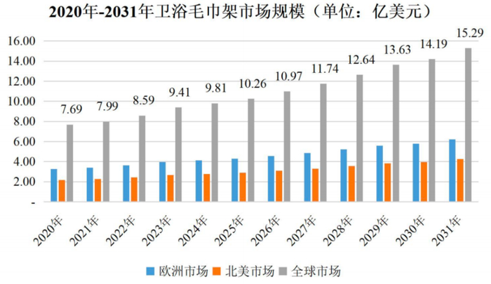 根據KBV Research的研究報告,衛浴毛巾架產品的市場規模將持續增長。2020年全球衛浴毛巾架市場規模為7.7億美元,預計到2031年,市場規模將達到15.3億美元。