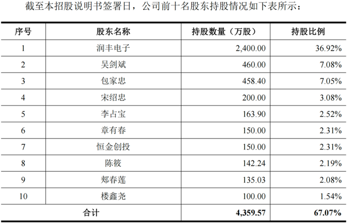 發行前,吳劍斌直接持有公司7.08%的股份,并通過潤豐電子控制公司36.92%的股份,合計擁有公司44%的表決權,發行后降為33%,為公司實控人。