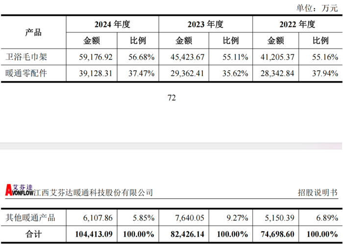 2024年,艾芬達總營收10.5億,扣非凈利潤1.3億。其中衛浴毛巾架是主力,在主營中的收入占比為57%,毛利占比61%。