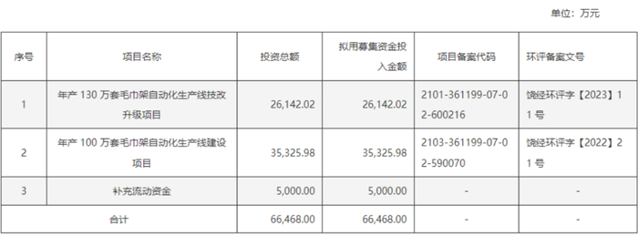 此次上市,公司擬募資6.6億,主要用來實施“年產130萬套毛巾架自動化生產線技改升級項目”、“年產100萬套毛巾架自動化生產線建設項目”。