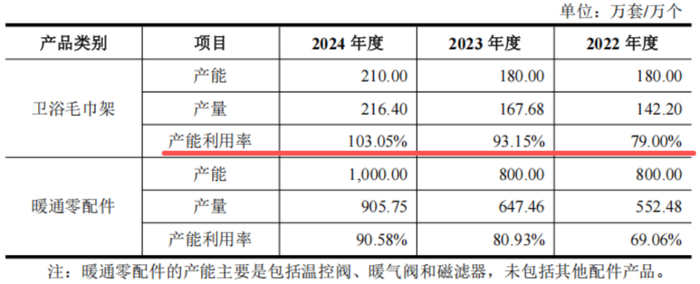 “年產100萬套毛巾架自動化生產線建設項目”是對公司現有業務進行的擴張。報告期內,公司衛浴毛巾架產品的產能利用率逐年提高,2024年已達103%。