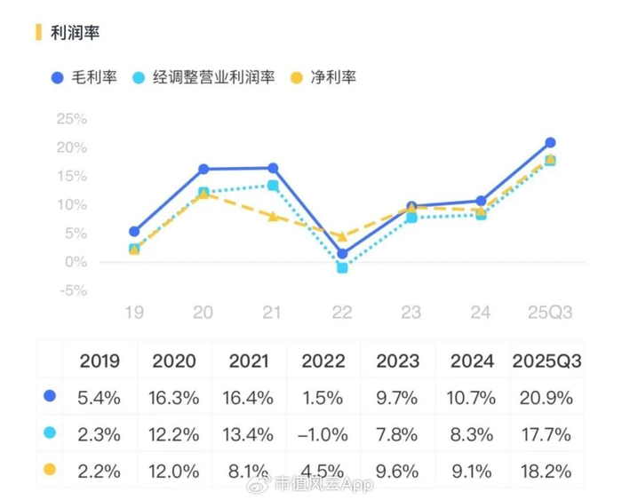 與此同時,公司盈利能力全面改善。2025年前三季度,公司毛利率提升至20.9%,較2024年提高了10個百分點;凈利率達18.2%,ROE提升至13.7%,達到近五年來的最高水平。