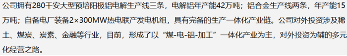 公司自1996年上市以來,始終專注于鋁產業,現已形成42萬噸電解鋁產能及15萬噸鋁加工產能的產業布局,并逐步向“氧化鋁-電解鋁-鋁加工”全產業鏈延伸。
