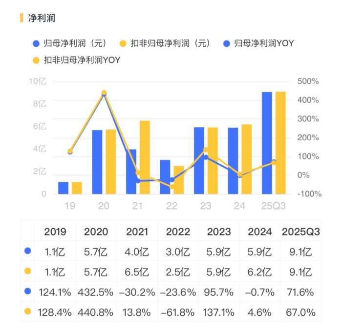 2025年前三季度,公司營收49.8億元,同比增長4%;歸母凈利潤9.1億元,同比大幅增長71.6%。單季度看,2025年第三季度公司歸母凈利潤達3.7億元,同比增長120%,呈現加速增長態勢。
