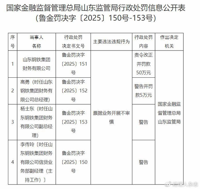 - 楊士東,時任山東鋼鐵集團財務有限公司副總經理,鑒于其在業務開展過程中的管理職責,被予以警告處分。