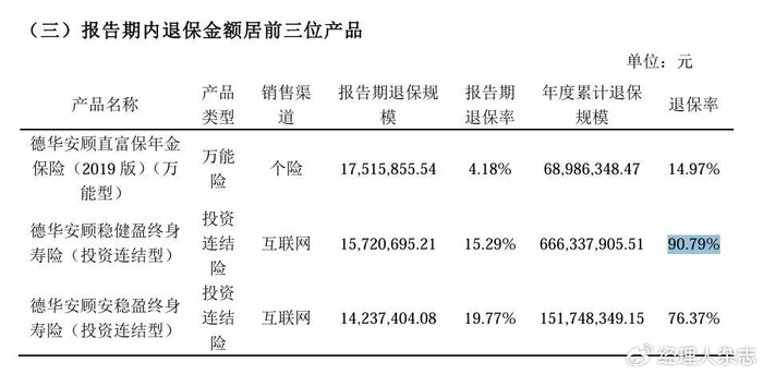 其中,“德華安顧穩(wěn)健盈終身壽險(投資連結型)”表現(xiàn)較為典型,年度累計退保規(guī)模為6.66億元,而退保率高達90.79%,進一步佐證了整體高退保率主要由單一特定產(chǎn)品周期性問題所致,而非系統(tǒng)性經(jīng)營風險。