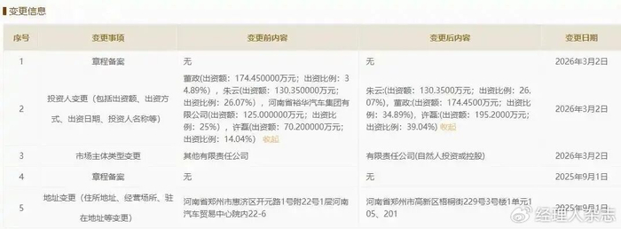天眼查APP顯示,1月27日,信陽裕華起航、南陽裕華福源兩家汽車銷售服務有限公司同步發生投資人變更,廣匯系的裕華汽車集團退出,常春星耀宏圖汽車銷售服務有限公司接手,出資額分別為1700萬元和2800萬元;2月6日,陜西福達汽車服務有限公司也完成投資人變更,星耀宏圖以1.1億元的出資額接手,而這三家門店均為AITO問界用戶中心。
