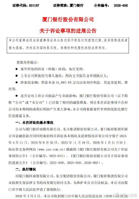 2026年3月6日晚間,廈門銀行(601187.SH)發布訴訟進展公告,披露其與廈門銀祥油脂有限公司(下稱“銀祥油脂”)、東方集團股份有限公司(下稱“東方集團”)、廈門銀祥集團有限公司(下稱“銀祥集團”)的4.19億元金融借款合同糾紛,已正式進入強制執行階段。廈門市中級人民法院于3月5日受理該執行申請,出具(2026)閩02執2459號《受理案件通知書》,標志著這場歷時近一年的金融糾紛進入債權追償的關鍵環節。