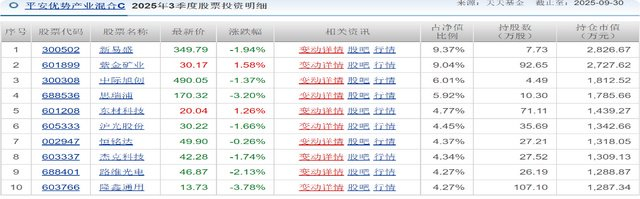 黃經(jīng)理采用“適度集中重倉(cāng)股 + 分散行業(yè)配置”的策略,對(duì)深度研究的標(biāo)的提高持倉(cāng)集中度(單只重倉(cāng)股占比最高達(dá) 5.92%),同時(shí)通過覆蓋科技、消費(fèi)、制造等多元領(lǐng)域,降低單一行業(yè)波動(dòng)風(fēng)險(xiǎn)。例如,平安優(yōu)勢(shì)產(chǎn)業(yè)混合的前十大重倉(cāng)股分布于汽車零部件、半導(dǎo)體、資源、家電等 6 個(gè)行業(yè),既保證了核心資產(chǎn)的收益彈性,又通過行業(yè)輪動(dòng)平滑組合波動(dòng)。