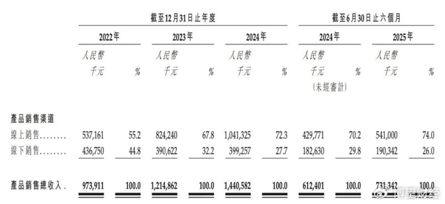 在渠道策略上,蔓迪是國內(nèi)最早全面擁抱電商的醫(yī)藥品牌之一。線上渠道收入占比從2022年的55.2%快速提升至2024年的72.3%,電商復(fù)合增長率約40%。