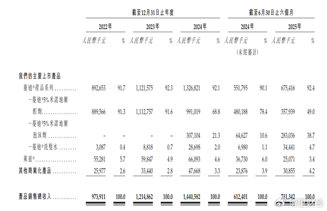 盡管業(yè)績持續(xù)增長,但蔓迪極度依賴單一成分。2022年至2025年上半年,米諾地爾系列產(chǎn)品占總收入的比例分別高達(dá)91.7%、92.3%、92.1%和92.4%。盡管公司通過不同濃度與劑型(如泡沫劑)進(jìn)行產(chǎn)品延伸,本質(zhì)上仍是在同一藥理戰(zhàn)場上的內(nèi)部挖掘。