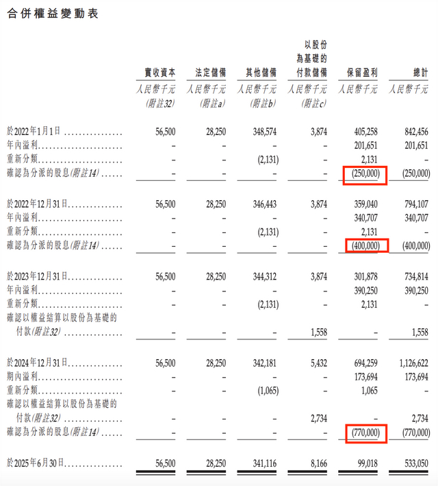 與此同時,蔓迪在上市前的一系列大額派息動作,也引發(fā)了市場的廣泛關(guān)注。根據(jù)財務(wù)報表,2022年至2024年,公司累計派息達(dá)14.2億元人民幣。2025年上半年更是一次性派息7.7億元,超過2022年和2023年總和。