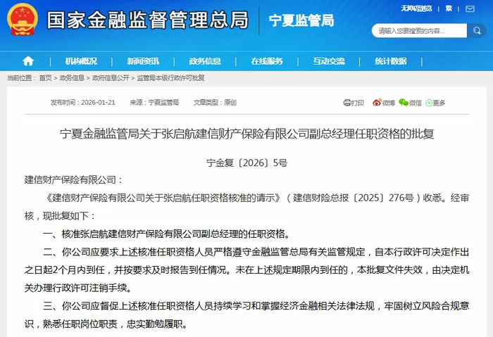 近日,寧夏金融監管發布任職資格批復顯示,核準張啟航建信財產保險有限公司副總經理的任職資格。