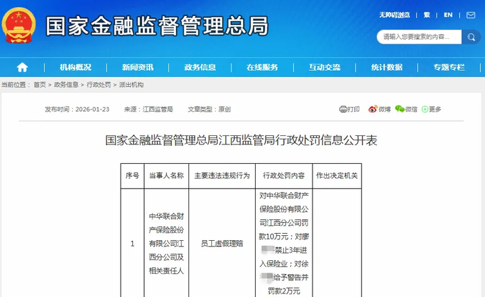 近日,國家金融監督管理總局江西監管局發布行政處罰信息顯示,中華聯合財產保險股份有限公司(以下簡稱“中華聯合財險”)江西分公司及相關責任人因存在員工虛假理賠的違規行為,江西金融監管局對中華聯合財險江西分公司罰款10萬元;對廖**禁止3年進入保險業;對徐**給予警告并罰款2萬元。