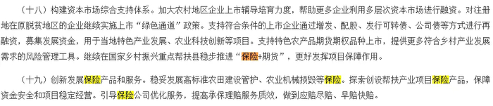《意見》“五、強化金融多業態協同(十八)構建資本市場綜合支持體系”提到:繼續在國家鄉村振興重點幫扶縣穩步推進“保險+期貨”,更好發揮項目保障作用。