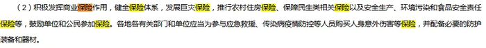 《應急預案》“6 應急保障 6.2 財力支持(2)”提到:積極發揮商業保險作用,健全保險體系,發展巨災保險,推行農村住房保險、保障民生類相關保險以及安全生產、環境污染和食品安全責任保險等,鼓勵單位和公民參加保險。各地各有關部門和單位應當為參與應急救援、傳染病疫情防控等人員購買人身意外傷害等保險,并配備必要的防護裝備和器材。