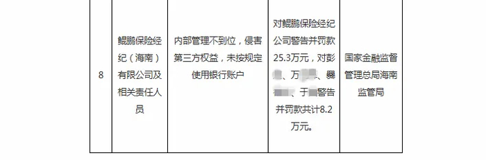近日,國家金融監(jiān)督管理總局海南監(jiān)管局發(fā)布行政處罰信息顯示,鯤鵬保險(xiǎn)經(jīng)紀(jì)(海南)有限公司及相關(guān)責(zé)任人員存在“內(nèi)部管理不到位,侵害第三方權(quán)益,未按規(guī)定使用銀行賬戶”的違規(guī)行為。海南金融監(jiān)管局對(duì)對(duì)鯤鵬保險(xiǎn)經(jīng)紀(jì)公司警告并罰款25.3萬元,對(duì)彭*、萬**、爨**、于*警告并罰款共計(jì)8.2萬元。