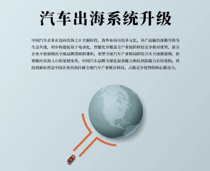 中國汽車企業(yè)正邁向出海2.0全新階段,海外布局日趨多元化,從產(chǎn)品輸出逐漸升級為生態(tài)共建,初步構(gòu)建起基于電動化、智能化并覆蓋全產(chǎn)業(yè)鏈的科技競爭相對優(yōu)勢,部分企業(yè)開始展現(xiàn)出全球品牌潛質(zhì)的雛形,重塑全球汽車產(chǎn)業(yè)格局的綜合實力逐漸展現(xiàn)。但要順應出海2.0的深刻變革,中國汽車品牌全球化敘事能力和抗風險能力有待重構(gòu)??萍紕?chuàng)新依然是中國企業(yè)出海打破全球汽車產(chǎn)業(yè)既有格局、占據(jù)競爭優(yōu)勢的核心推動力。