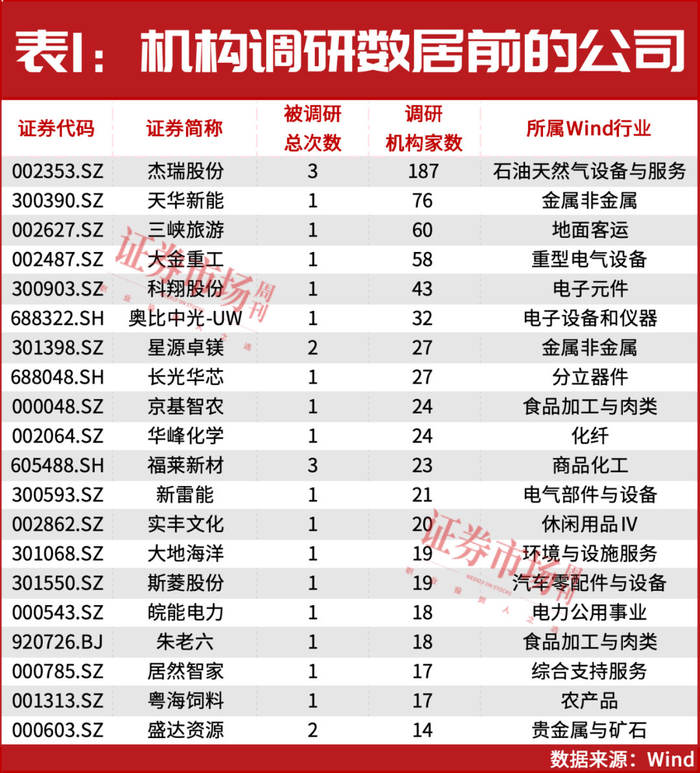 此外,獲得機構投資調研數居前的公司還有三峽旅游、大金重工、科翔股份等(見表1)。?