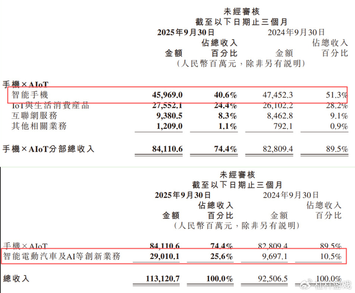 另一邊,第三季度小米手機×AIoT分部收入僅增長1.6%為841.1億元;其中智能手機收入甚至同比下降3.1%為459.7億元,占總收入比從去年同期的51.3%下降至40.6%。