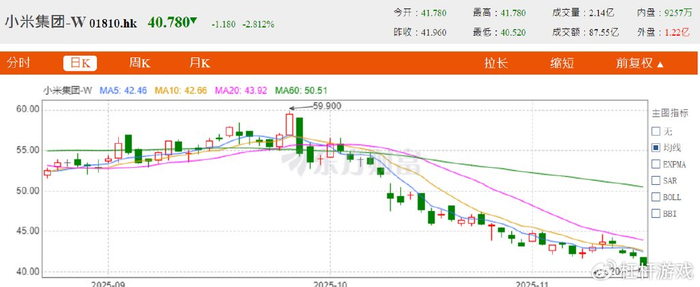市場則一直在用錢投票:截至11月18日收盤,小米港股當日跌幅2.812%,近一個月來跌幅已超30%。