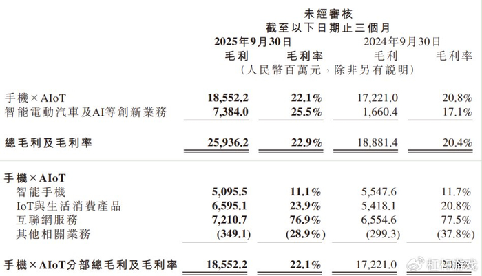 不過,小米汽車光環背后也有一些微妙的陰影。比如毛利率的微妙下滑。盡管汽車業務實現了經營盈利,但其毛利率卻從2025年第二季度的26.4%微降至25.5%。