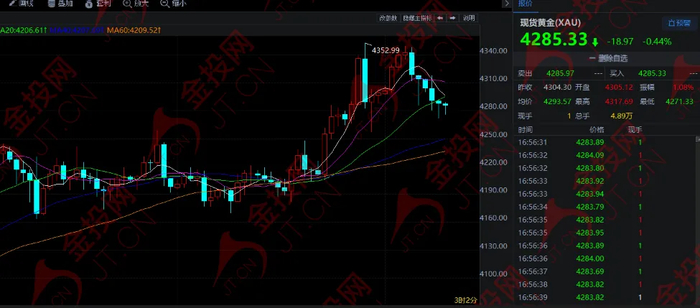 隔夜,現貨黃金經歷了沖高回落的劇烈波動,一度逼近4350美元關口的心理高位,這幾乎觸及了上周五創下的逾七周新高,金價很快回吐了大部分漲幅,最終收報4304.91美元,僅微漲約0.1%。今日歐市盤中,黃金小幅下跌,目前在4283美元附近徘徊。