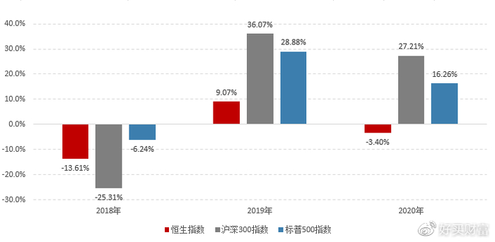 2018-2020港股、A股、美股主要指數漲跌幅對比