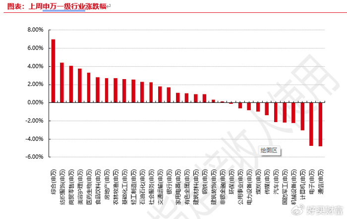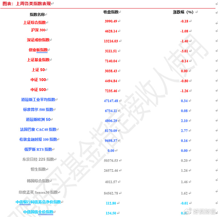 好買基金研究中心顯示,上周,滬深兩市雙雙收跌。截止收盤,上證綜指收于3990.49點,跌7.06點,跌幅為0.18%;深成指收于13216.03點,跌188.02點,跌幅為1.40%;滬深300收于4628.14點,跌50.65點,跌幅為1.08%;創業板收于3111.51點,跌96.70點,跌幅為3.01%。兩市成交101131.15億元。總體而言,大盤股強于小盤股。中證100下跌0.80%,中證500下跌1.26%。31個申萬一級行業中有20個行業上漲。其中,綜合(申萬)、紡織服飾(申萬)、商貿零售(申萬)表現居前,漲跌幅分別為6.99%、4.41%、4.06%,計算機(申萬)、電子(申萬)、通信(申萬)表現居后,漲跌幅分別為-3.03%、-4.77%、-4.77%。
