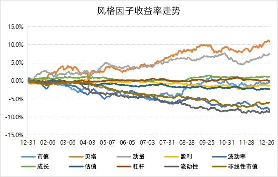 縱觀全年,貝塔和動量因子表現尤為突出,這對應了量價風格在2025年的整體強勢,也為常見的量價類策略提供了十分有利的運行環境。同時,在AI與新能源等板塊的帶動下,成長風格整體優于價值風格。相比之下,盈利、杠桿等基本面因子全年未能走出顯著行情。