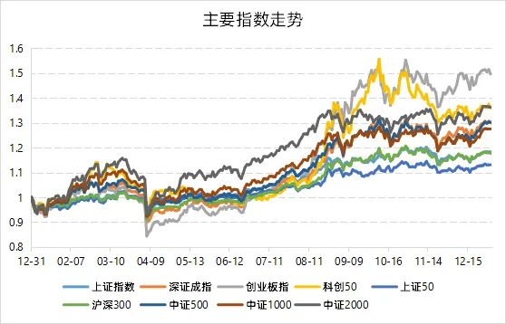 從全年表現來看,創業板指以49.6%的漲幅位居寬基指數首位,緊隨其后的是代表小盤風格的中證2000指數,全年上漲36.2%。而上證50受大盤價值風格相對疲軟的影響,表現較為溫和,全年收益為12.9%。