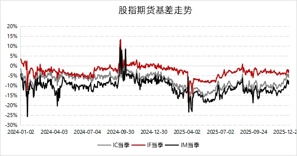 這一趨勢在2025年得以延續——4月初受特朗普關稅事件影響,三大股指基差在短期內快速走闊,一度接近2024年初的高位水平。此后,基差經歷了約三到四個月的持續收斂,到9月初已回落至較低區間,隨后轉入震蕩格局。臨近年底,隨著市場情緒再度回暖,基差也重現收斂態勢。