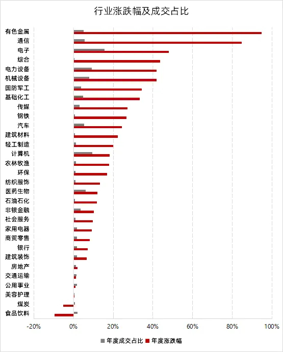 2025年A股市場的表現,呈現出清晰的“科技+資源”雙主線驅動格局。從行業層面來看,有色金屬板塊受益于全球通脹環境、AI電力需求帶動(如銅),以及地緣政治催生的避險情緒(如黃金),全年漲幅接近95%,在各行業中遙遙領先。與此同時,AI算力建設的提速與光模塊等硬件需求的爆發,也強力拉動了通信與電子行業,兩者漲幅分別位居第二和第三。