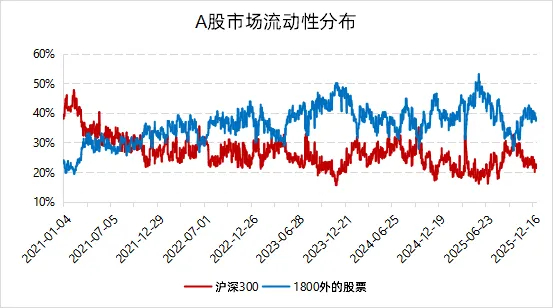 若以全市場1800(即滬深300、中證500、中證1000)以外的股票作為市場中小盤股的代表來看的話,幾年來隨著A股上市公司數量不斷增多,1800以外的股票成交占比整體呈現出穩步上升的趨勢,基本圍繞40%的中樞水平波動,并與以大市值為代表的滬深300成交占比形成此消彼長的互補格局。