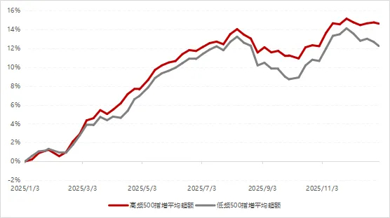 從我們跟蹤的樣本來看,換手率較高的500指增策略(年化換手超過100倍)在2025年的整體表現優于低頻策略,尤其在第三季度超額收益回調期間,高頻策略受市場“抱團”行情的影響相對更小,平均回撤幅度也更可控。