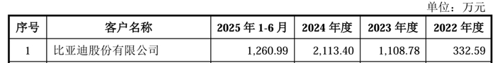 到2023年時,比亞迪一躍成為公司第一大客戶,銷售額大漲233%至1108.78萬元。此后,比亞迪站穩了第一大客戶的位置。