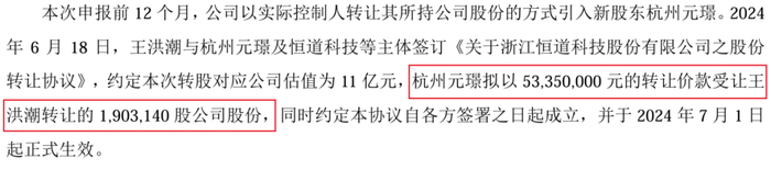 此后,恒道科技沒有通過增資方式引資,而是王洪潮以轉讓股權的形式套現。遞表北交所前半年(2024年6月),王洪潮向杭州元璟轉讓190.31萬股公司股份(對應4.85%股權),套現5335萬元。