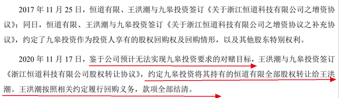 2017年11月,恒道有限、王洪潮與九皋投資簽訂相關增資協議,約定了九皋投資享有的股權回購權及回購情形。