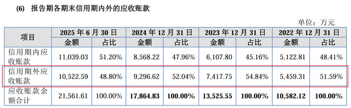 實際上,恒道科技約一半應收賬款已經逾期。報告期內,逾期應收賬款占總應收賬款的比例分別為51.59%、54.84%、52.04%和48.80%。