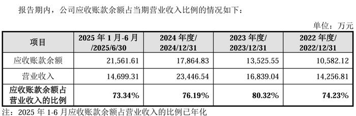 只不過,不少業績只是“紙面富貴”。報告期內,公司應收賬款分別為1.06億元、1.35億元、1.79億元和2.16億元,占當期營業收入的比例分別為74.23%、80.32%、76.19%和73.34%(已年化)。