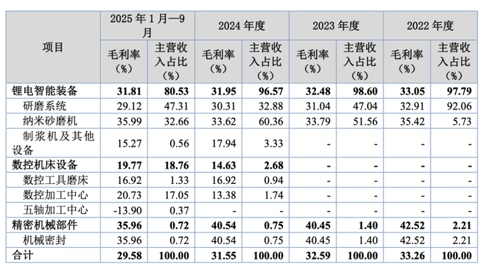 2024年,數控機床設備業務開始產生收入,2024年和2025年前9月貢獻的營收占比分別為2.68%、18.76%,對應的毛利率分別為14.63%和19.77%,明顯低于同期公司的整體毛利率(31.55%和29.58%)。