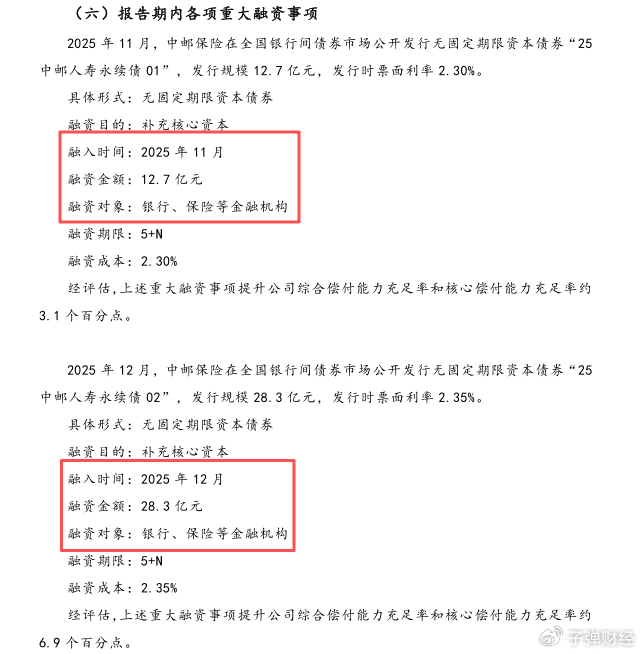 償付能力報(bào)告顯示,在2025年11月至12月,中郵人壽發(fā)行了兩期無固定期限資本債券分別為12.7億元、28.3億元,合計(jì)融資規(guī)模達(dá)41億元。