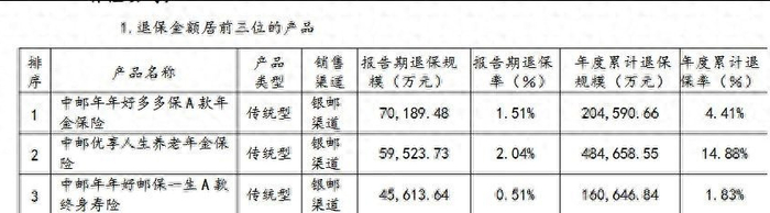 中郵年年好多多保A款年金保險(xiǎn):作為一款傳統(tǒng)型銀郵渠道產(chǎn)品,其報(bào)告期退保規(guī)模達(dá)到70,189.48萬(wàn)元,退保率為1.51%,年度累計(jì)退保規(guī)模為204,590.66萬(wàn)元,年度累計(jì)退保率為4.41%。