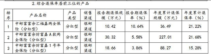 中郵富富余財(cái)富嘉A款兩全保險(xiǎn)(分紅型):報(bào)告期退保規(guī)模為30.32萬(wàn)元,退保率為5.58%,年度累計(jì)退保規(guī)模為227.01萬(wàn)元,年度累計(jì)退保率為21.68%。