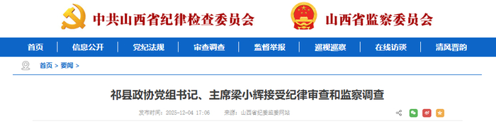 12月4日,據(jù)山西省紀(jì)委監(jiān)委網(wǎng)站消息,祁縣政協(xié)黨組書記、主席梁小輝涉嫌嚴(yán)重違紀(jì)違法,目前正接受晉中市紀(jì)委監(jiān)委紀(jì)律審查和監(jiān)察調(diào)查。