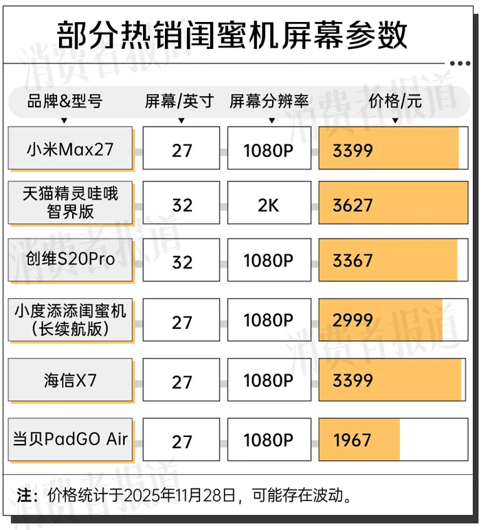 2、追求顯示效果的消費者優先考慮搭載高刷新率、4K顯示屏的閨蜜機(4K屏產品普遍比1080P屏產品貴30%左右)。