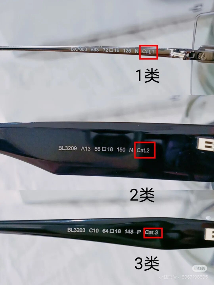● 按鏡片分類有淺色太陽鏡(0類和1類)、遮陽鏡(2類和3類)、特殊用途太陽鏡(4類),等級越高光線阻隔率越高。如果是日常防曬,建議選擇2類、3類即可,如果是滑雪、海邊等場景需要選擇4類。