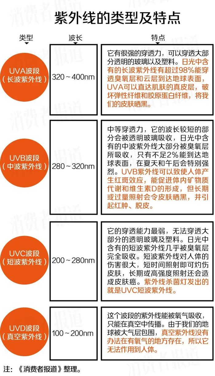 按波長范圍,紫外線可分為UVA、UVB、UVC和UVD四個波段。其中,UVC和UVD絕大多數被大氣層阻隔,對人類健康影響極小。UVA與UVB則被皮膚科學界重點關注,前者主要導致曬黑與光老化,后者則引起曬紅和曬傷。