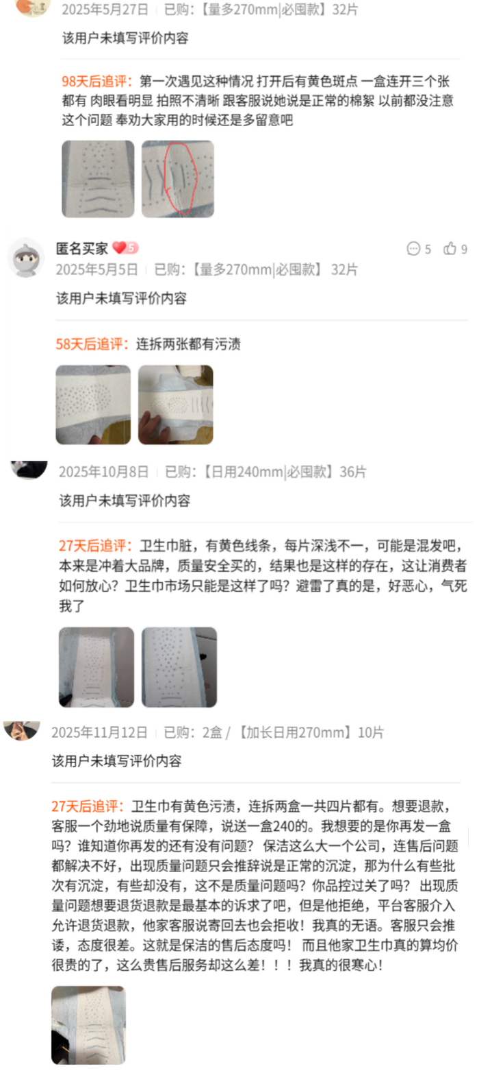▲消費者反映液體衛生巾有污漬(圖源:某電商平臺旗艦店的產品評論區)