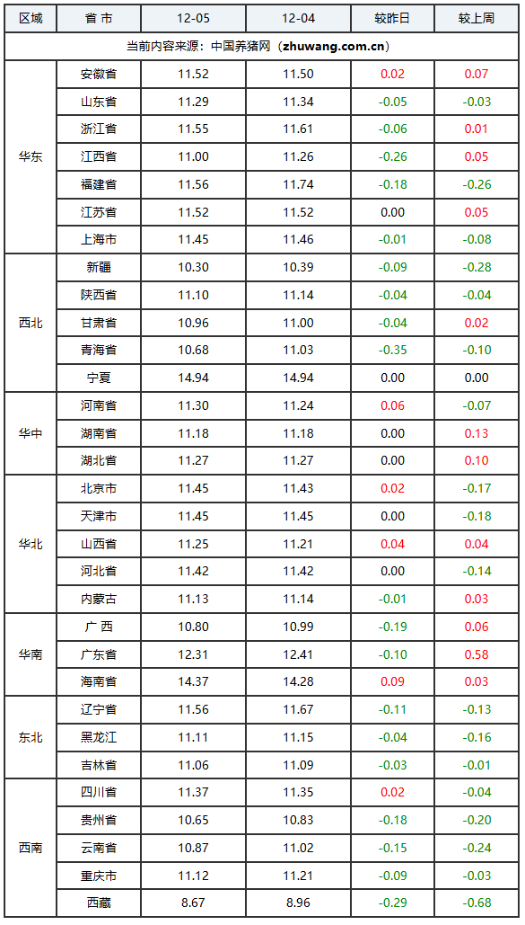 豬價下跌地區(19個):福建省、甘肅省、青海省、廣東省、江西省、新疆維吾爾自治區、山東省、浙江省、上海市、陜西省、內蒙古自治區、廣西壯族自治區、黑龍江省、吉林省、遼寧省、貴州省、云南省、西藏自治區、重慶市;下跌區間:0.01-0.35元/公斤;